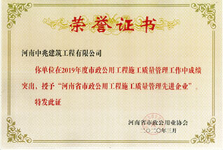 2019年度河南省市政公用工程建設質(zhì)量管理小組優(yōu)秀獎